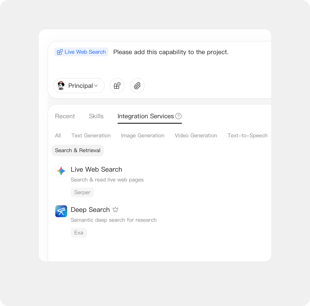 Login, payments, AI models — just say the word. Auto-integrated, no API docs needed.
